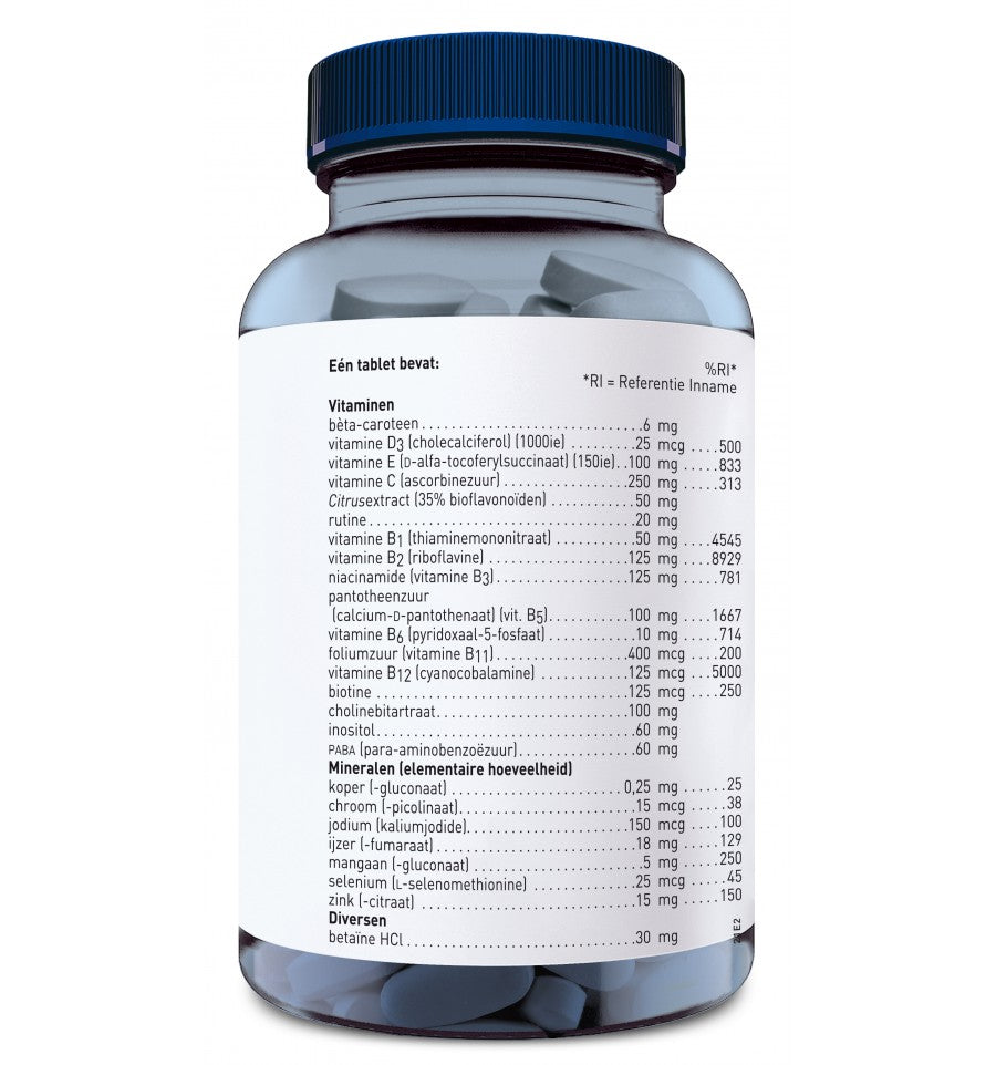 vitaminen, vulstof (microkristallijne cellulose), mineralen, cholinebitartraat, antiklontermiddel (siliciumdioxide, magnesiumstearaat, stearinezuur), inositol, PABA, Citrusextract, glansmiddel (hydroxypropylmethylcellulose, glycerine), betaïne HCl, rutine.