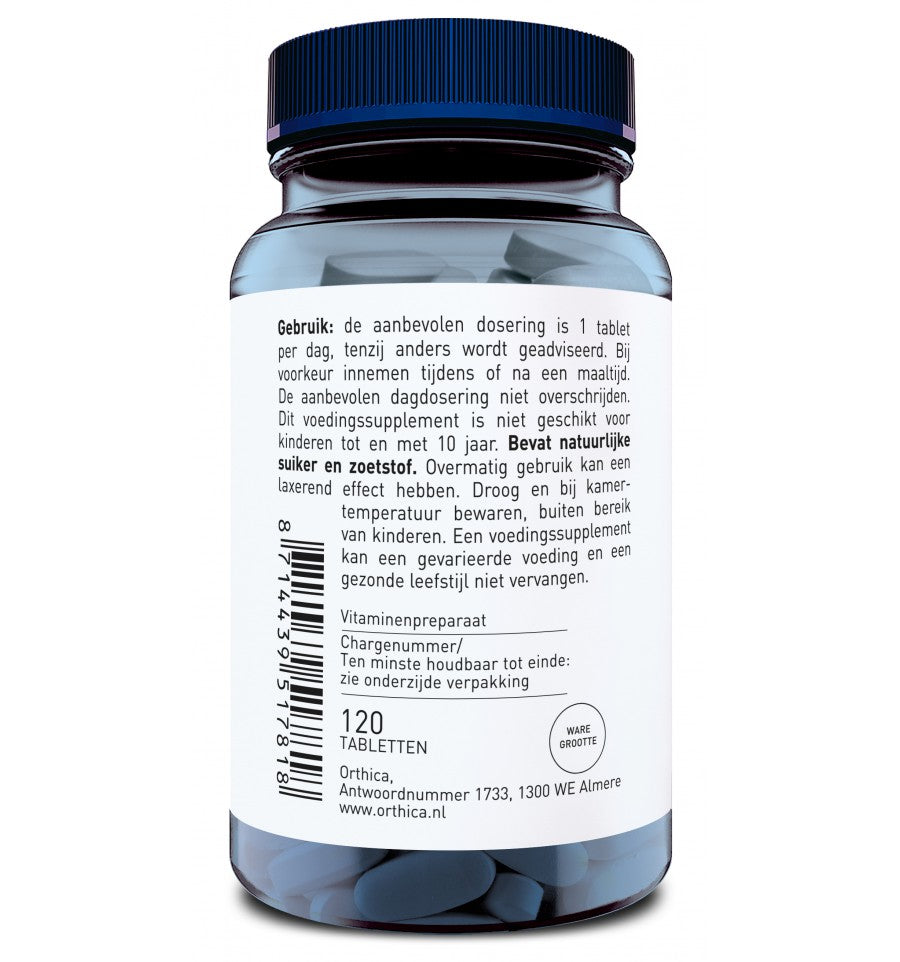 De aanbevolen dosering is 1 tablet per dag, tenzij anders geadviseerd. Bij voorkeur innemen tijdens of na een maaltijd. Dit voedingssupplement is niet geschikt voor kinderen tot en met 10 jaar. Bevat natuurlijke suiker en zoetstof. Overmatig gebruik kan een laxerend effect hebben.